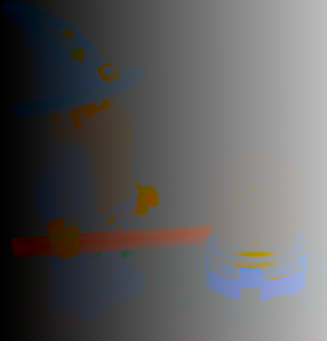 The LCh Lightness image is more washed out and has lost a lot of the detail that the HSV Value preserved. Doing the same for the Toy image I got: