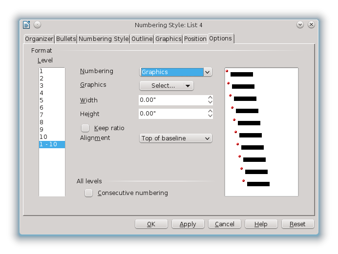 Generally you don’t try to do Outlining with bulleted lists, so the Outline tab is not anything we will spend time on. But on the last tab, Options, there is a little feature kind of buried that lets you use your own graphics for your bullets if you wish to use something special.