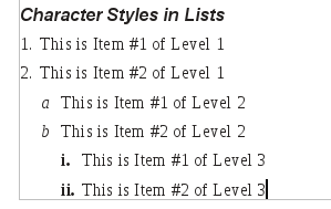 Next is the Character Style box. This lets you apply a Character style to the characters used for your number lists. We have discussed Character Styles previously, and this lets you bring that great functionality into your numbered list. Here is an example I created where I set Level 2 to have a Character style of Emphasis, and Level 3 to have a Character style of Strong Emphasis: