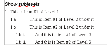 Next is “Show sublevels”. This is used often for things like contracts where this type of numbering is required for clauses. With “Show sublevels” each of the levels above is repeated in the level number, so that the first Level 2 item to appear under the first Level 1 item would be numbered 1.1. an example of such a list is: