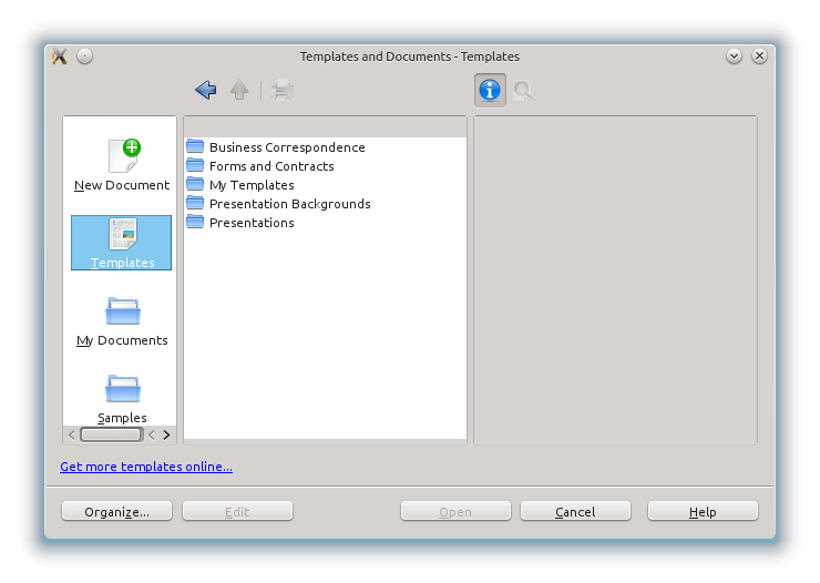 In LibreOffice Writer, as in just about every word processing program currently available, templates are the basis for all documents you create. LibreOffice has two kinds of templates, for Writer (word processing) and Impress (presentation graphics), which are stored in adjacent folders. You can access Templates when you first open LibreOffice by selecting the Templates link, or you can access your templates in Writer by going to File–>New–>Templates & Documents. Either way you get this window: