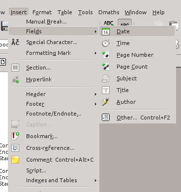 Do do this, first open a new document by pressing Control+N. When I do this, of course, I will get a document that is pre-configured to start with a Heading 1, because that is how my default template is configured. But all I have to do is go to the Apply Style selector in the upper left, and change it to Text Body. Then, I need to consider how I want my letter to be laid out. I usually put the date first, and have it flushed to the right. So I will press the Flush Right button, and now my insertion mark is on the right margin of the page. Next, I know that if I use this template many times I will always want to current date to appear. That is also easy, since I can use a Field to do this. All I need to do is go to Insert–>Fields–>Date: