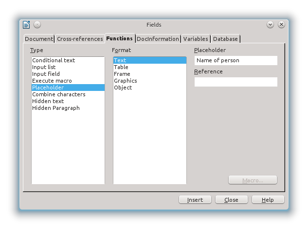Next, I hit Enter a couple of times, then the Flush Left button to put my Insertion mark on the left. I type “Dear “, that is the word Dear followed by a space. Then I insert another field to prompt me for the name of the person. I go to Insert–>Fields–>Other, and it brings up the dialog for Fields. Select the Functions tab, then under Type select “Placeholder”, for Format select “Text”, and in the Placeholder box type “Name of person”.