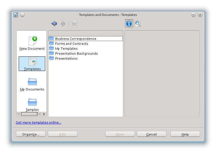 You will have several folders to choose from, but the folders are a little different depending on your platform. This screen shot shows what is available on my Linux machine. To get a template you need to double-click on a folder to see the contents. But if you do this on a fresh installation you will discover that the cupboards are bare. No problem! Look on the lower left, and there is a link that says “Get more templates online…” Clicking this link will take you to http://templates.libreoffice.org/