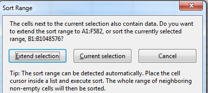 If you clicked “Current Selection” Column B would be sorted all by itself, but the other columns would not be sorted. This used to be the default behavior of spreadsheets, but we have learned that people do attempt these kinds of manipulations on data sets in spreadsheets, so now it is smart enough to check. If you select “Extend selection”, it will sort based on what is in column B, but will sort the dataset, from cell A1 to cell F582. If you make this selection you will get another window: