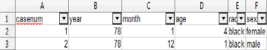 These drop-downs will give you an entry for each unique value in the column. For a column like Case Number this feature is useless since each row has a unique case number. But if we wanted to only look at cases from 1978, we could go the Year column, click the drop-down, remove the check-mark from “All” in the bottom of the dropdown, which de-selects everything, then put a checkmark in “78” to select only that. The result is to display only those rows which have “78” in the Year column. And if you look at the row numbers on the left, every time one or more rows was skipped, there is a heavier line separating the row numbers. Also, for each column that has a filter applied there will be small black square in the lower-right corner of the drop-down arrow box. This is helpful if you need to quickly see where the filters are applied, such as when you need to remove one.
