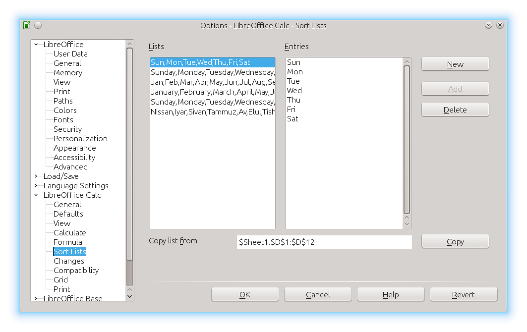 The next thing you can try is to enter “January” in the first cell, then fill your row or column. And you will discover that Calc will continue the fill with “February”, “March”, “April”, etc. And the same thing with “Monday”. That will get you “Tuesday, “Wednesday”, etc. These are examples of lists, and Calc comes with a number of these built-in. Where can you find these lists? They can be found by going to the Tools menu–>Options–>LibreOffice Calc–> Sort Lists, and when you select this a window will open: